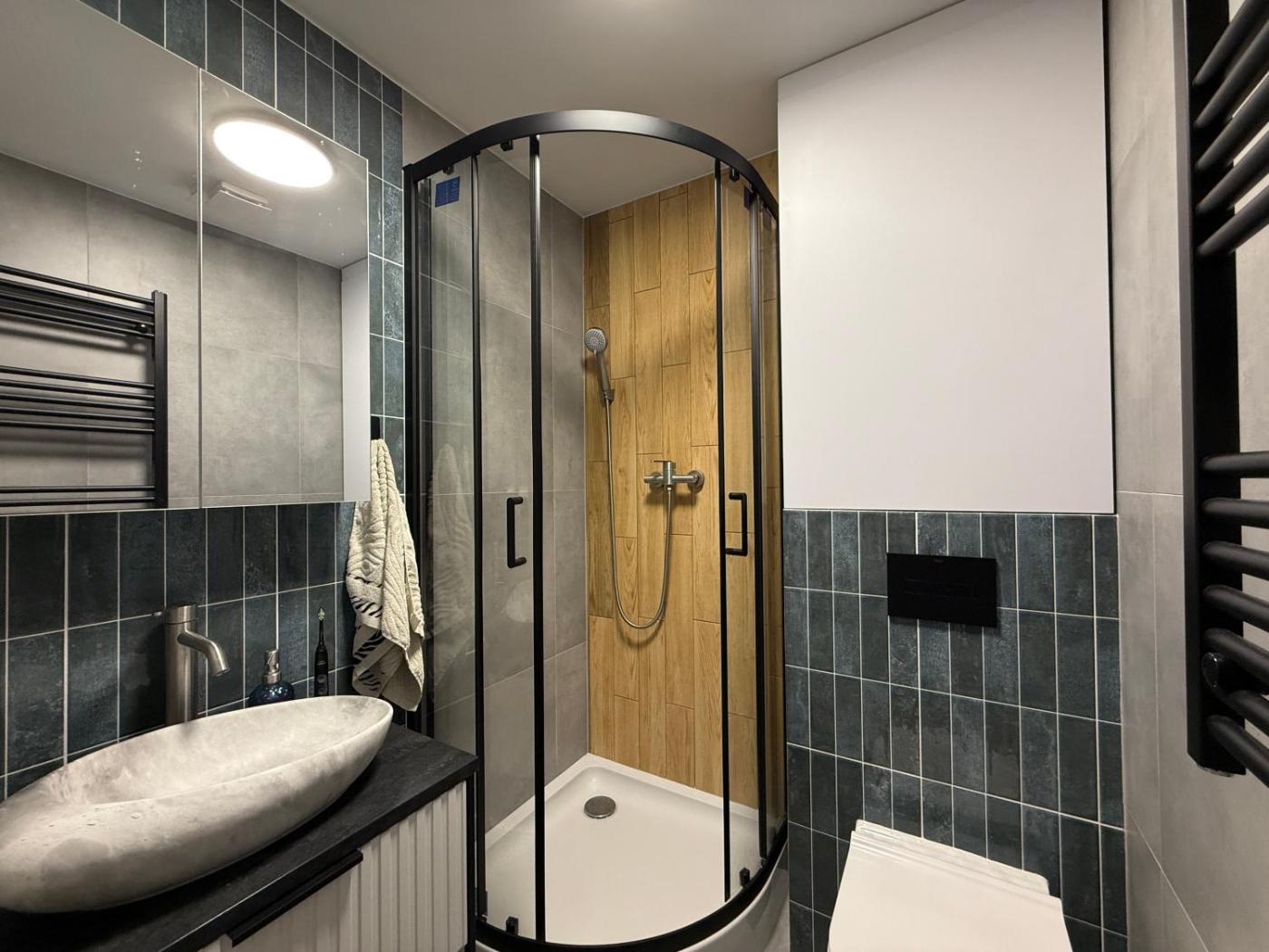 Apartament z 1 sypialnią. This apartment includes 1 bedroom, kitchenette, a terrace and 1 bathroom with a shower. The kitchenette is fitted with a stovetop, a refrigerator and kitchenware. The apartment offers a washing machine, a private entrance, a tea and coffee maker, a wardrobe, as well as a flat-screen TV with streaming services. The unit has 1 bed. Apartament - 2 osobowy. Powierzchnia pokoju ok.: 15 mkw.