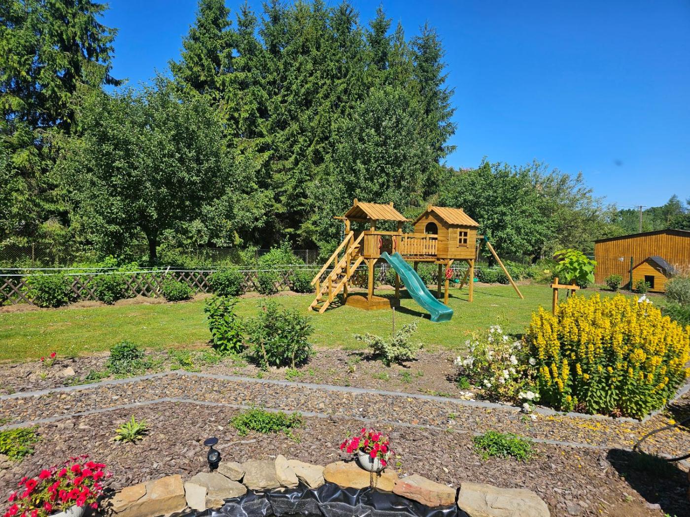 Dom z 2 sypialniami. The holiday homes kitchen is available for cooking and storing food. Featuring a terrace with garden views, this holiday home also provides heating and a flat-screen TV. The unit offers 4 beds. Dom wakacyjny - 5 osobowy. Powierzchnia pokoju ok.: 42 mkw.